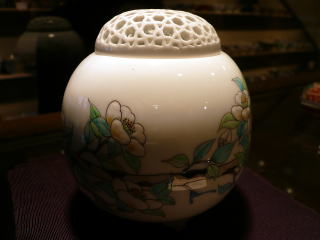 六角の面にすべて白梅が描かれた香炉です。白梅の花がとても可憐に描かれています。また各面の白梅がすべて異なるデザインになっているところも特筆すべき点でしょう。